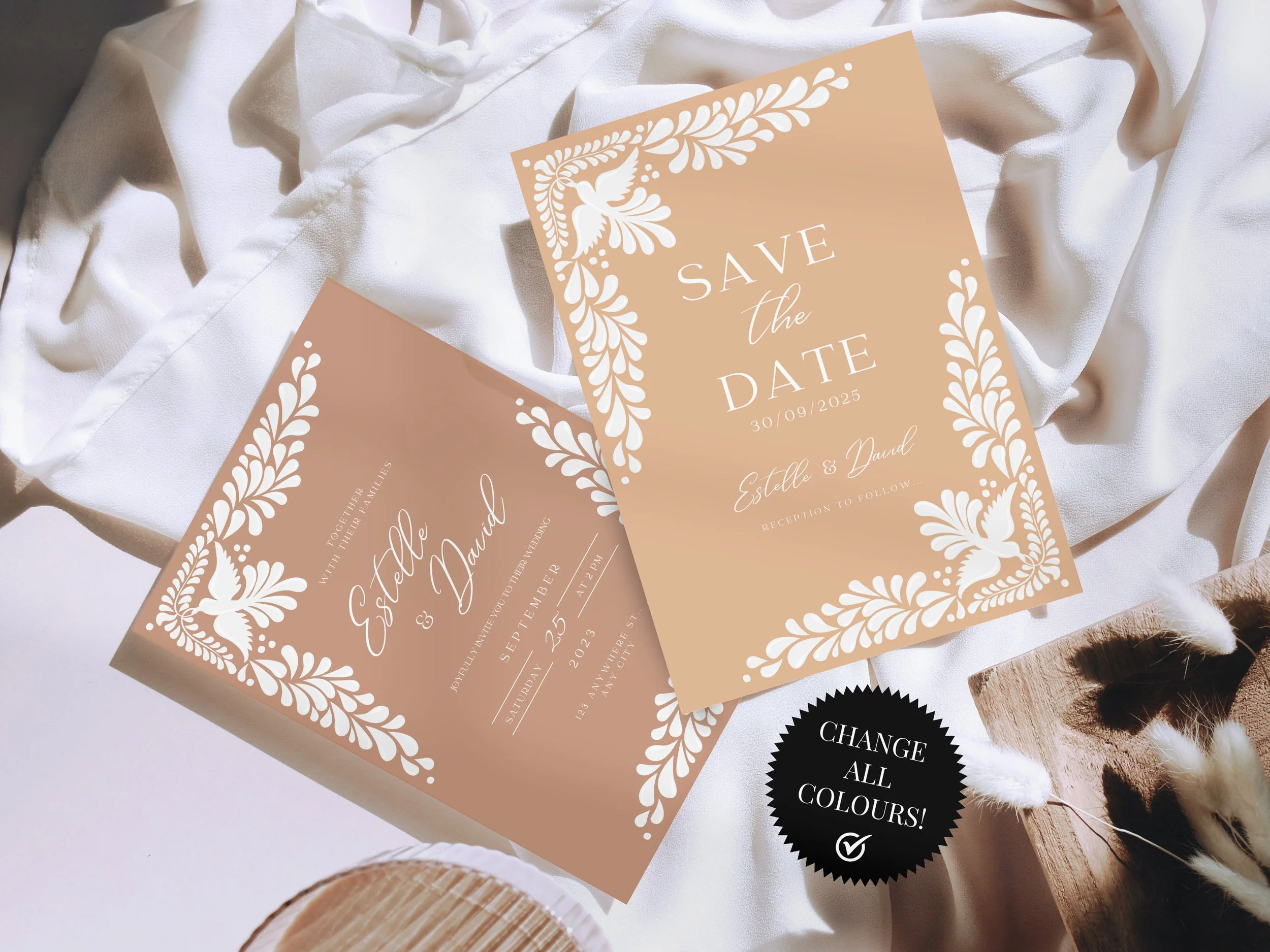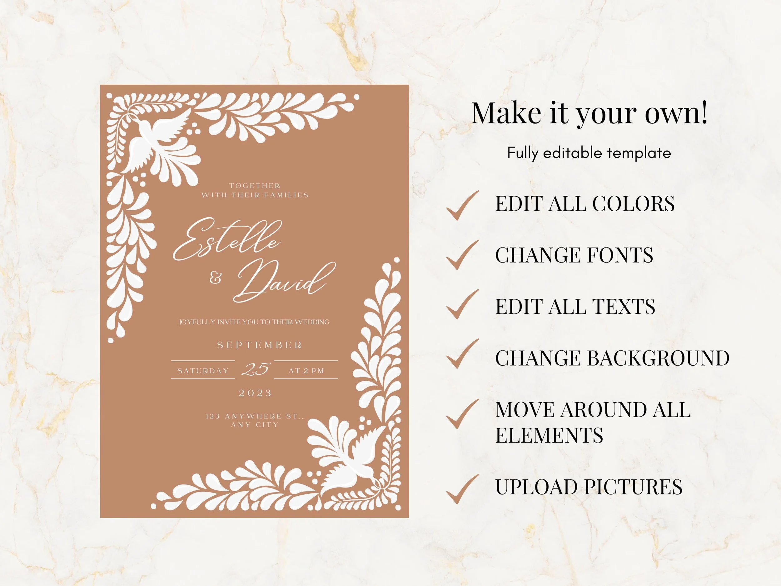 Celebrate your special day with this stunning Talavera Wedding Bundle. With easy editing on Canva, you can customize these Modern Wedding templates to fit your unique style. From the font to the color of every element, these Invitation & Save the Date, RSVP, Details, Place Card Templates are designed for you to make them your own. Instantly download and start creating your dream wedding invitations today!